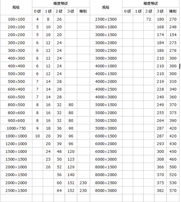 檢驗(yàn)平板精度:按標(biāo)準(zhǔn)計(jì)量檢定規(guī)程執(zhí)行,分別為1,2,3級(jí)和精刨四個(gè)級(jí)別。